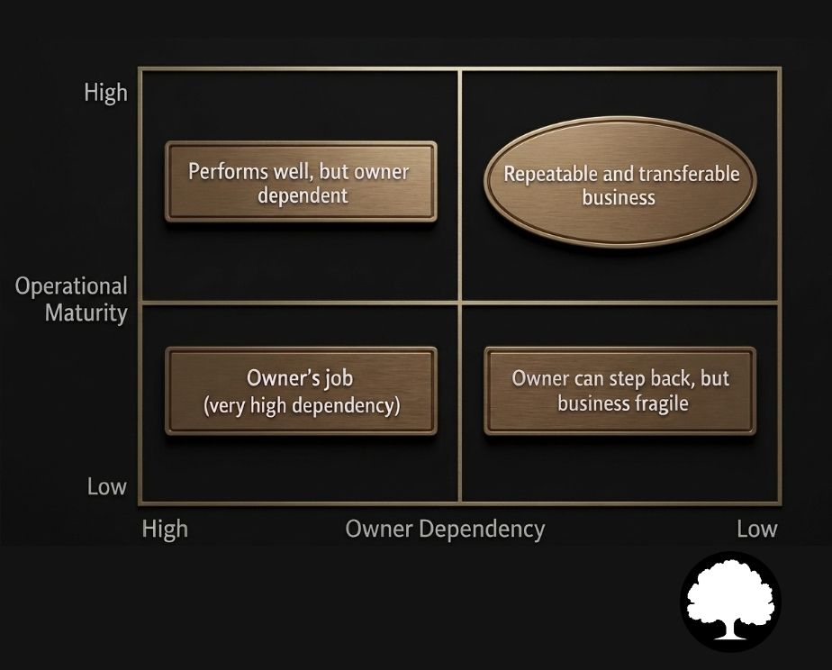 The bottom-right quadrant in the model is an important reminder that an owner stepping back does not automatically mean a business is sale-ready. It is possible for owner dependency to reduce while the business remains operationally fragile. Processes may still be informal. Roles may still be unclear. Standards may vary across the organisation. That business may be less dependent on the owner day to day, but it is not yet truly resilient.